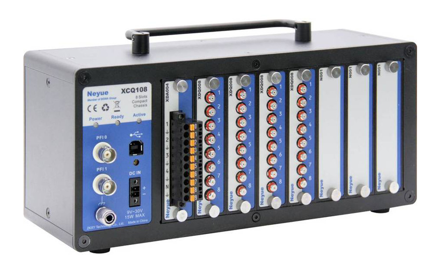 XCQ108 是重庆胜德新声电技术有限公司推出的一款新型可扩展多通道数据采集系统,可支持插入 8 块模拟数据采集卡或模拟输出卡,最多可创建 64 通道的多功能的组合测量仪器。机箱另带有两个通用输入输出 PFI 接口,可作为脉冲输入或输出之用,使用 USB 接口与计算机进行数据传输。
