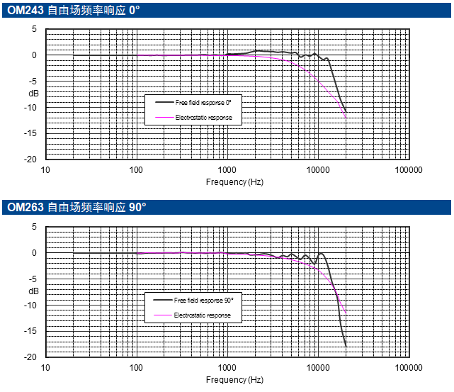 OM243 的频率响应针对 0° 入射进行优化,主要用于飞机和机场噪声测量。OM263 则针对 90° 入射优化,主要面对城市、交通和工业噪声测量。两种户外传声器都经过特殊声学设计,以满足在规定入射方向上,其自由场频率响应都在 IEC61672-1 的限值范围内。每支传声器都附有单独的出厂校准证书,包含整套户外传声器的实测灵敏度和自由场频率响应数据,用户可使用校准证书对测量数据进行修正以获得更精确的结果。