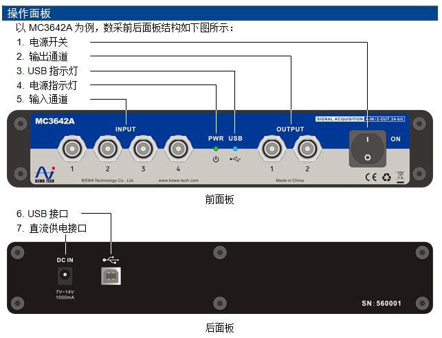MC3642A/B 基于高性能数据采集模块开发,配有四个输入通道(带四挡可调增益),两个输出通道,可同时采集分析四个通道的声学和振动信号。配合 VA-Lab 系列测试软件使用,适用于大部分声学和振动测试场景。