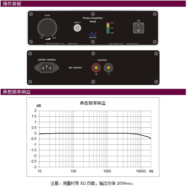 | 频率响应 | 10Hz~20kHz(+0dB ~ -0.5dB,8Ω,20WRMS) |