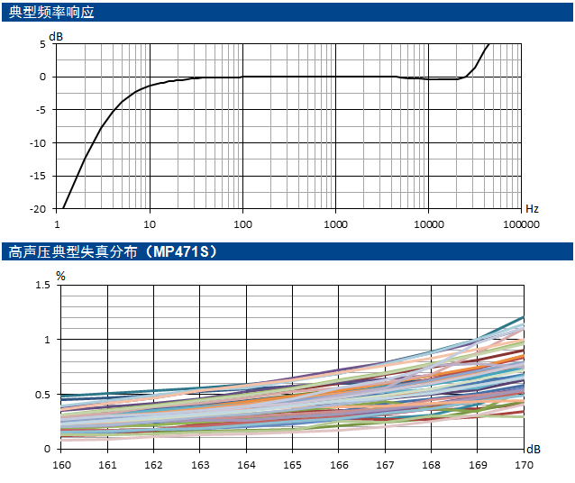 MP471S / MP472S / MP473S 采用高强度镍金属膜片,通过提高膜片张力提高了传声器最大声压级,同时使灵敏度低至约 0.5mV/Pa,也避免了 ICCP 前置放大器限制传声器的最大输出电压,可以测量高达 180dB 的声压级。每只传声器在出厂前都经过高声压测试,以验证在达到额定最高声压级时其总失真≤ 3%。