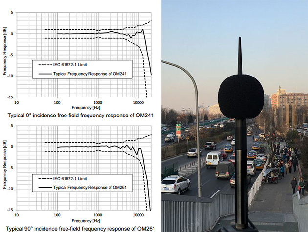 OM241 的频率响应针对 0° 入射进行优化,主要用于飞机和机场噪声测量。OM261 则针对 90° 入射优化,主要面对城市、交通和工业噪声测量。两种户外传声器都经过特殊声学设计,以满足在规定入射方向上,其自由场频率响应都在 IEC61672-1 的限值范围内。每支传声器都附有单独的出厂校准证书,包含整套户外传声器的实测灵敏度和自由场频率响应数据,用户可使用校准证书对测量数据进行修正以获得更精确的结果。