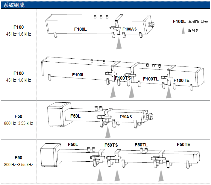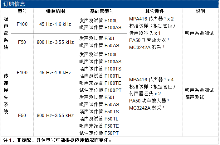 F 系列的阻抗管系统适用于双传声器传递函数法,仅需一次测试即可获得全测量频率范围内的材料法向吸声系数和声阻抗率,相较于基于驻波比法设计的驻波管,显著提升了材料声学特性的测试效率。而传递损失管系统适用于四传声器传递函数法,通过测量四个固定点在不同末端状态下的声压级,解析复传递函数,即可求得待测材料的传递损失。